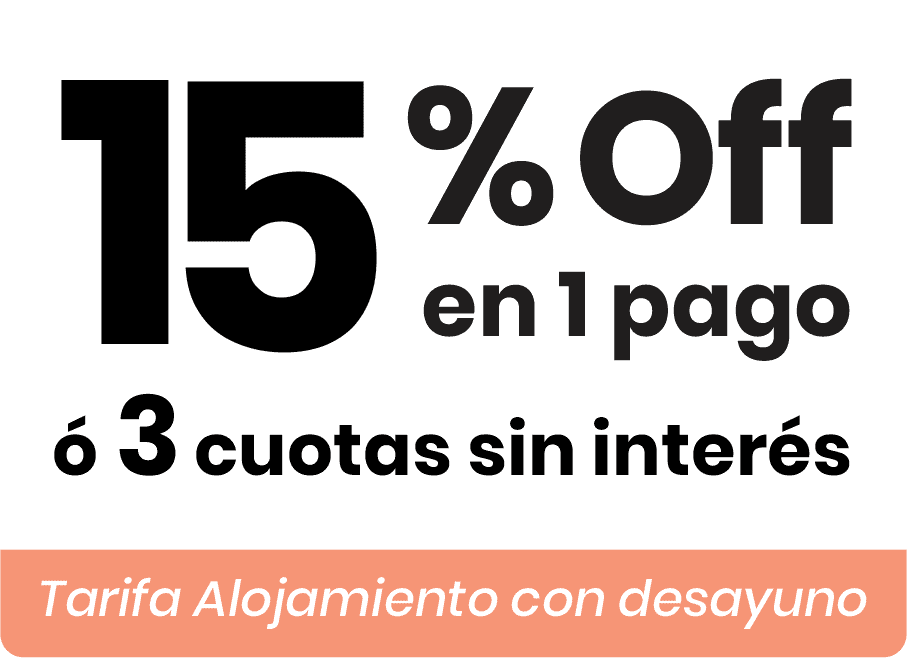 Alojamiento con Desayuno, cancelación flexible 15 off abonando en un pago mediante depósito transferencia o tarjeta de crédito en un pago o 3 cuotas sin interés.