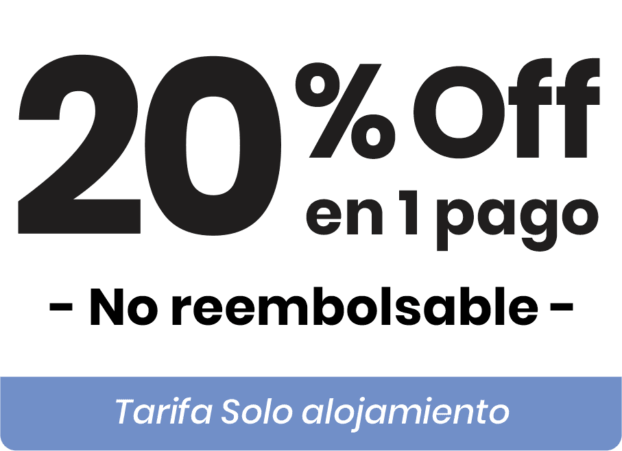 Solo Alojamiento no reembolsable 20 off abonando en un pago mediante depósito transferencia o tarjeta de crédito en un pago.